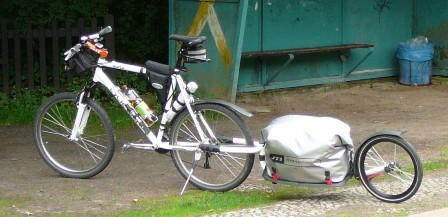 | Durch eine Lastverteilung wird nahezu das gesamte Gepäckgewicht dem Anhängerrad auflasten, d.h. das Hinterrad des Bike's wird, bei geschickter Packweise, kaum vom Gepäckgewicht zusätzlich belastet werden. | Das Gespann ist länger - eine Fahne am Hänger ist unbedingt erforderlich, da die Gefahr besteht, dass Kraftfahrer den Nachläufer übersehen. Außerdem rechnet kaum jemand damit, dass da am Fahrrad noch etwas hinterherkommt... |