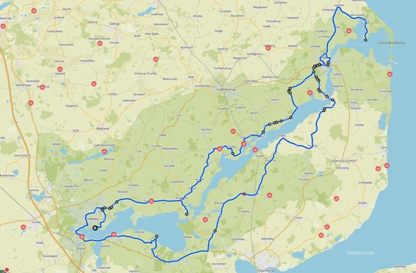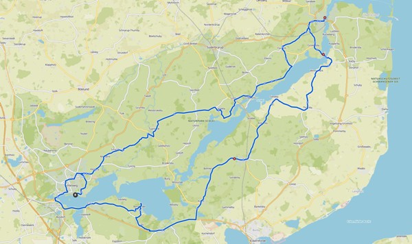 Ca. 120km (siehe Karte oben) - mit Abstechern nach Missunde und Maasholm werden es 145km (siehe Karte unten)