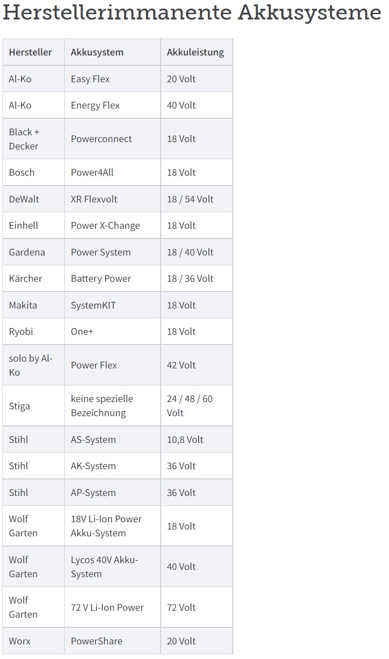 | Akkusystem | Hersteller | Akkuleistung |