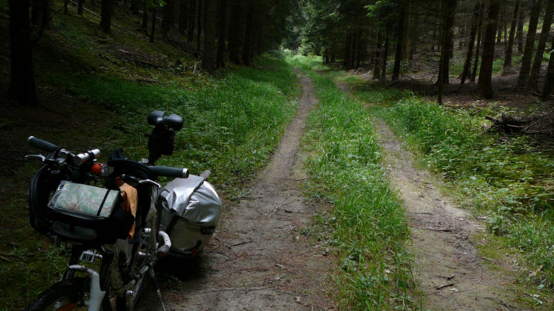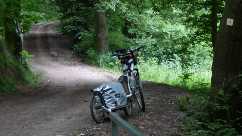 am Rennsteig geht es bergab. Das Fahrrad mit dem Anhänger war kaum zu