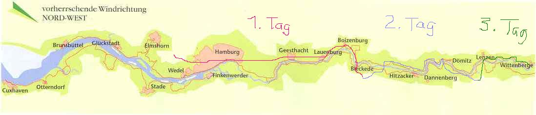 So fuhr ich gleich am nächsten Tag bei "Neu Darchau" mit der Fähre auf die Ost-Seite der Elbe. Dort stand ein Baustellenschild auf dem Deich, aber kein Absperrung. Diese war auf der anderen Seite, Richtung Boizenburg. Auf diesem Teilstück war anscheinend die Großbaustelle für die Deicherhöhung, wg. des Hochwassers von 2002. Die Deichstraße Richtung Dömitz war wie neu. Der Elberadweg sollte mich auf die Landstraße führen - ohne Radweg. Zwei Bauern, die neben einem laufenden Trecker standen, fragte ich, ob der Deichweg zu befahren ist. Beide meinten, das ist kein Problem. Und das war es auch nicht. Das Rad mit Anhänger lief wie geschmiert. Die Räder des Hängers fingen an zu "singen", bei ca. 30km/h. Besser geht nicht - mit Rückenwind!.