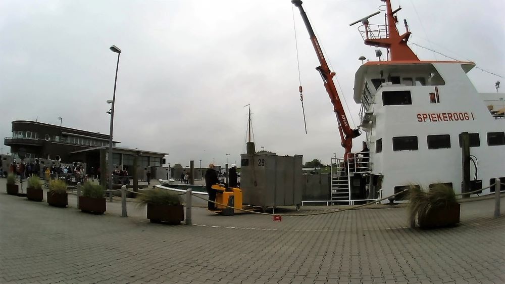 Gerade kam die Fähre und entlud die Container mit Koffern.