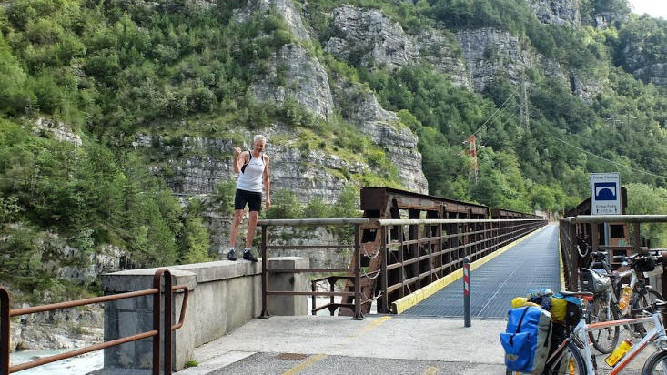 Mittags Am Vortag hatten wir bereits gesehen, dass der Bahntrassenweg in Resiutta wieder begann. Thomas meinte, es lohnt sich nicht mehr noch einmal bis Klagenfurt zu übernachten. Er hatte mich für die letzte Nacht der Tour zu sich in die Wohnung eingeladen. So sollten es an diesem Tag mehr als 120km werden. Manchmal ist es besser das vorher nicht zu wissen. Wir kannten unsere Leistungsfähigkeit und wussten, dass dies gut zu schaffen war. Diesen Radweg wird keiner so schnell vergessen, wenn er ihn selbst gefahren hat. Die gesamte Bahntrasse bis zur Grenze ist ein Teil des Alpe-Adria-Radweges. Es geht mit stetiger, aber mäßiger Steigung bergauf. Der Weg schlängelt sich an der Fella entlang, überquert sie, geht immer wieder durch kurze Tunnels - genial, was die Ingenieure vor ungefähr 100 Jahren geleistet haben. Bei Chiusaforte wechselt der Verlauf in Richtung Norden - bei Pontebba wieder nach Osten. Teilweise sieht die Streckenführung so aus, als ob es beim nächsten Berg nicht weitergeht. Eine wunderschöne Landschaft mit diesem Radweg bei Sonnenschein - besser geht nicht.