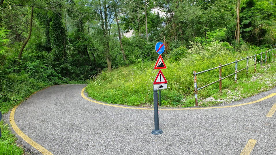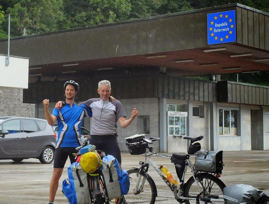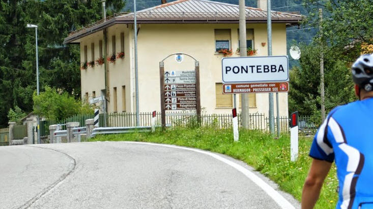 Nachmittags Vor Tarvisio wird das Tal offener und leider auch nicht mehr so schön. In der Pizzeria "Bar Alpino" haben wir uns ein Festmahl mit Vor- und Nachspeise gegönnt. Dies sollte ein schöner Abschluss der Radtour sein. Eine kleine Anerkennung, dass er es mit mir solange ausgehalten hat... Kaum hatten wir zu Ende gegessen, fing es an zu regnen. Der Radweg sollte uns noch bis zur Grenze begleiten. Schnell ein Foto gemacht und weiter auf den Radweg durch den Wald parallel zur Hauptstraße. Dieser ist nicht besonders lang, aber abenteuerlich - konzentriert fahren war angesagt - und das bei vollem Magen. |