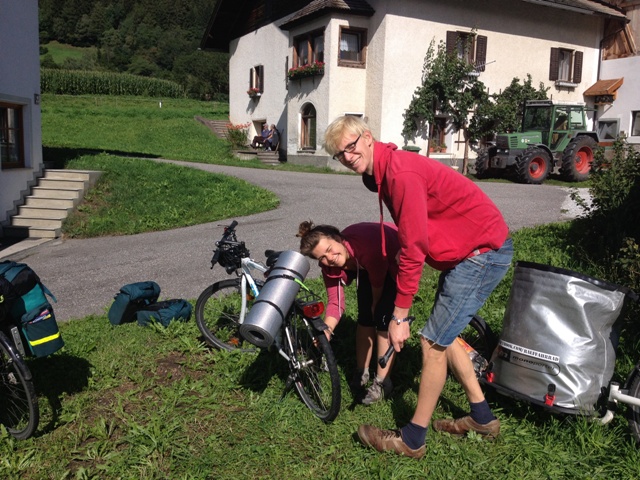 Abends In einem Dorf (Franzensfeste) machte ich den Vorschlag, nachdem Christina die weiße Fahne hochhielt (Sie konnte nicht mehr), bei einem Bauernhof zu fragen. Die Beiden gingen auf meine Vorschlag ein und setzen ihn gleich in die Tat um. Dieser Hof sah sehr ordentlich aus. Ich hätte nicht damit gerechnet, dass der Bauer sofort zusagte. Er sprach Deutsch und bot uns gleich eine Waschgelegenheit in der Melkhalle an. Dort befand sich sogar eine Dusche! Ich war total begeistert. Er kam nachher noch einmal wieder und kündigte für den Morgen Kaffee und Semmeln an - Wahnsinn. Ein schöner Abschluss des verregneten Tages. Vor der Halle kochten wir unsere Nudeln - das Standard Campingessen. Neben dem Wohnhaus stellten wir unsere Zelte auf. |