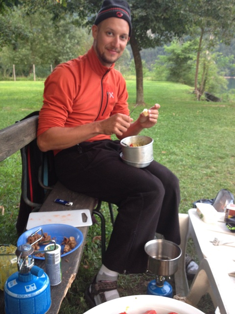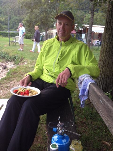 Abends Am See gibt es Bänke, auf denen man prima Abendessen kann. Es gab Rührei und Brot - mal was anderes. Mit viel Butter schmeckt das Ei besonders gut, meinte Thomas. So war es auch. Ohne Eier, Butter und Käse geht es gar nicht auf Campingtour. Noch ein Sprung in das viel kältere Wasser des Largo del Corlo, als das vom Kalderer See. Die Abende auf einer Fahrradtour gehen leider viel zu schnell vorbei. |