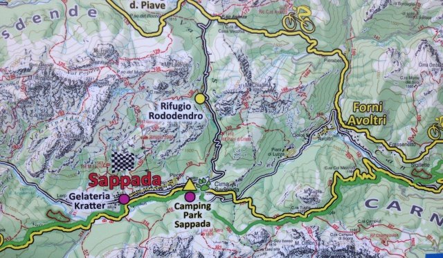 Nachmittags Auf der Straße ging es erst Mal flach weiter bis Santo Stefano di Cadore. Parallel zur Straße fließt immer noch die Piave. Die Steigung nimmt zu. Wir fahren erst am Campingplatz Alpinpark vorbei, freuen uns über die nette Bedienung hinter dem Tresen. Sie gibt uns viele Hinweise, was man hier noch alles machen könnte - wir wollten eigentlich nur eine Nacht bleiben. Unsere Fahrstrecke an diesem Tag war nicht besonders lang, aber dafür ereignisreich.