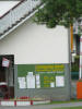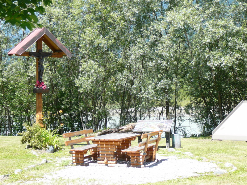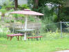 Es sind Sitzgelegenheiten mit Dach vorhanden. Das Dach ist aus Stahl