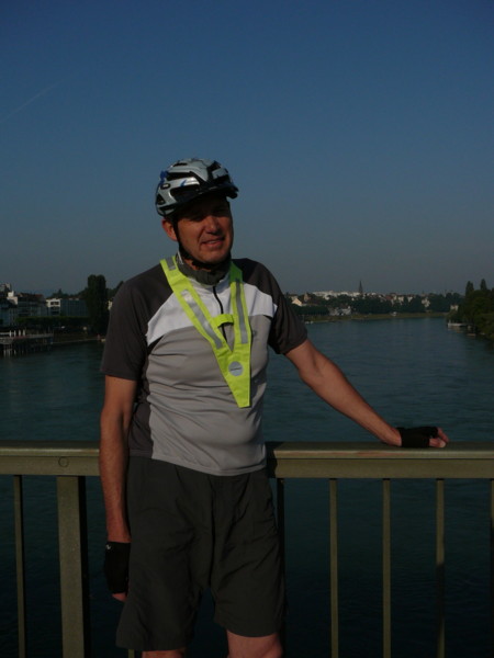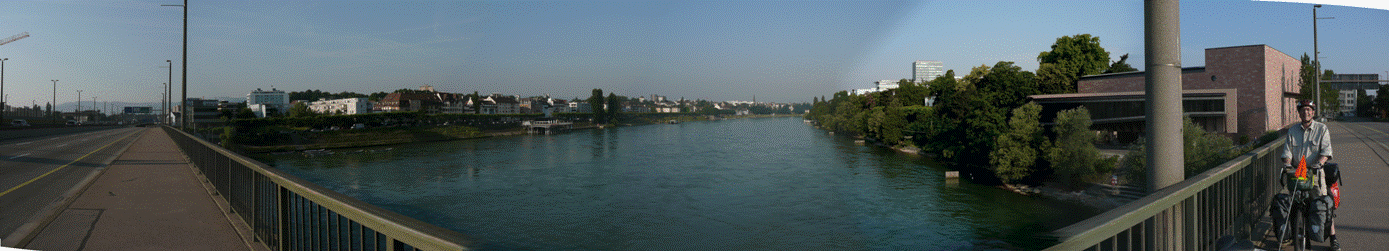 Morgens Ankunft Bhf Basel 6:44 Uhr - Sonnenschein - klarer Himmel - 25 Grad Erst fuhren wir auf der nördlichen Seite des Rheins. Nach ca. 2 Kilometern schlug ich Rainer vor auf die südliche Seite zu wechseln. Die ursprünglich geplante Route sollte genau anders herum durch die Schweiz führen. Das hatte evt. den Vorteil, dass wir weiniger Steigungen und Rückenwind hätten. Dies war eine Bauchentscheidung, die Rainer, ohne Diskussion annahm. Es stellte sich erst Tage später heraus, dass wir genau das Richtige taten! |