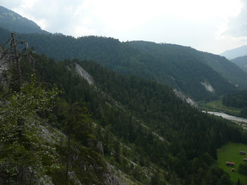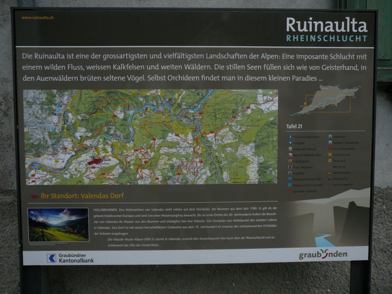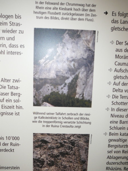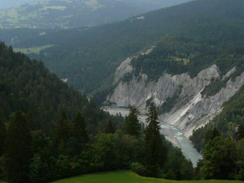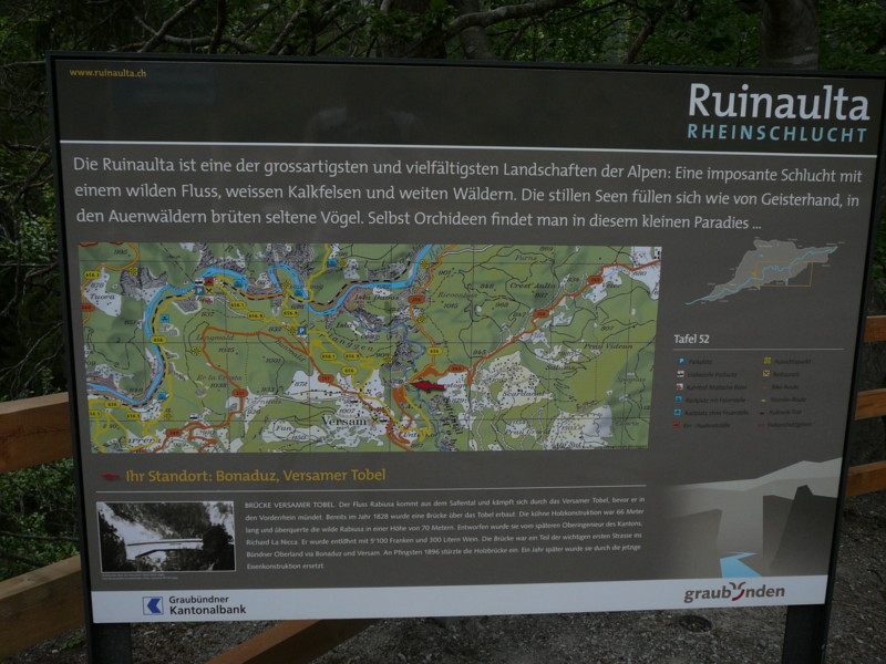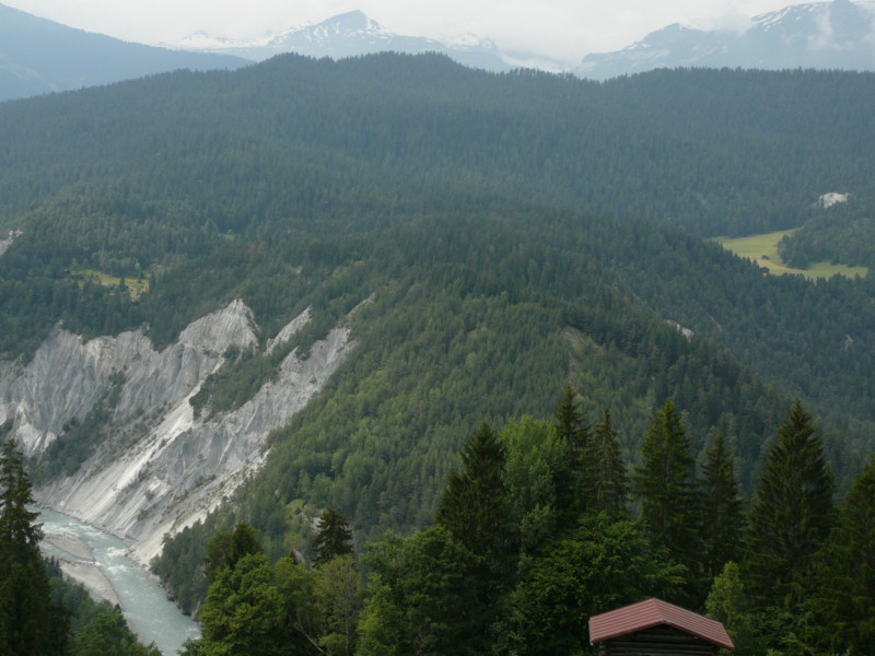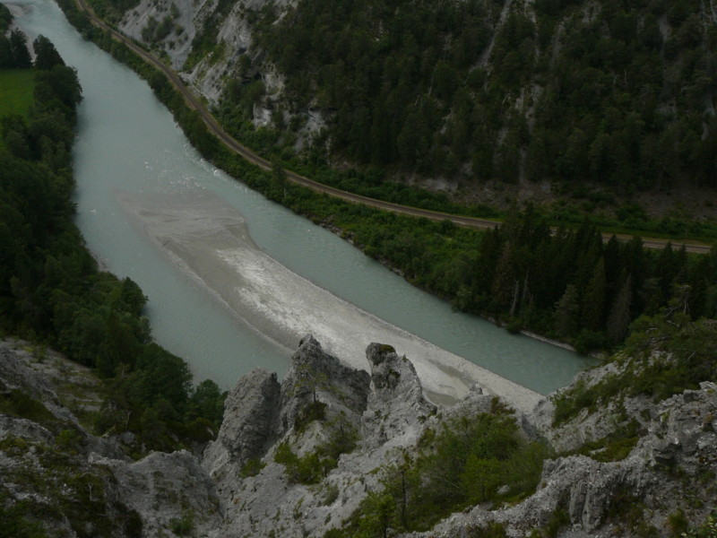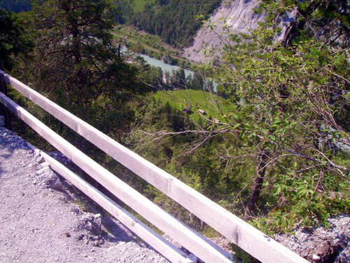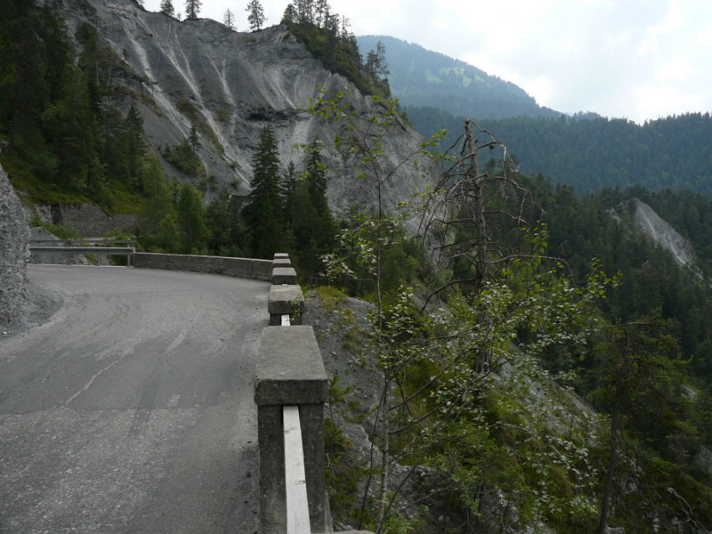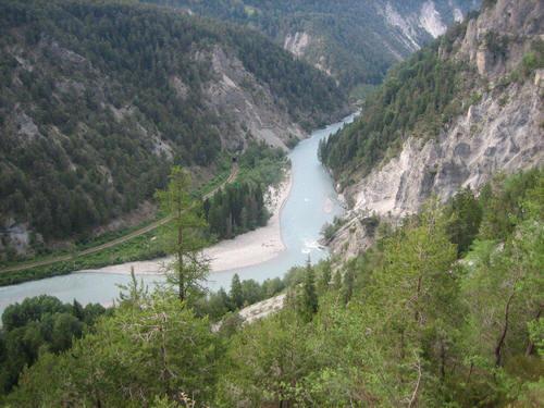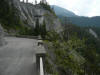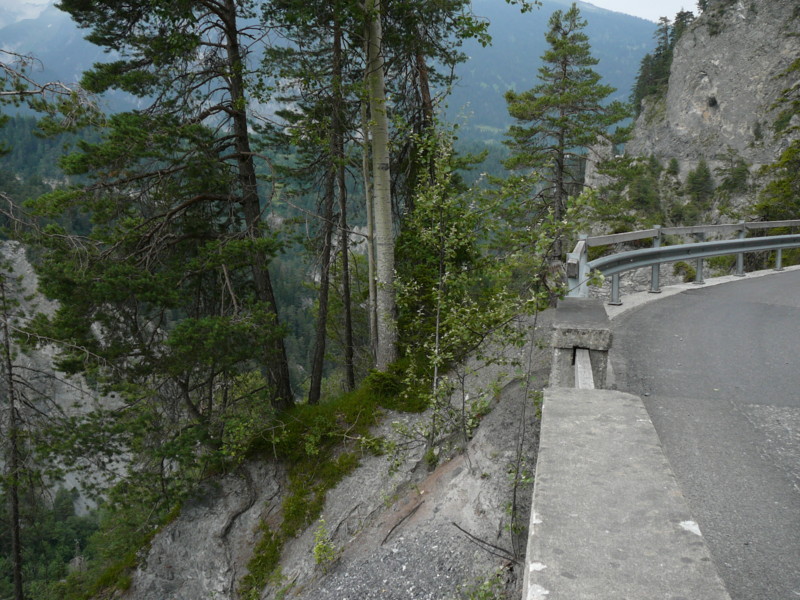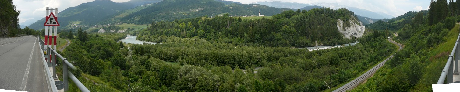 Mittags Es folgte eine wilde Fahrt hoch und herunter links und rechts - ich verlor meine Orientierung. Das machte überhaupt nichts, denn es gab nur diese eine Straße zur Rheinschlucht. Ein berauschender Ausblick und die gefährlichste Straße der ganzen Tour! Hier ist der Weg in den Fels gehauen worden. Es gibt ein paar Ausweichstellen, sonst passen noch nicht einmal zwei PKW's aneinander vorbei.