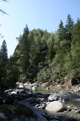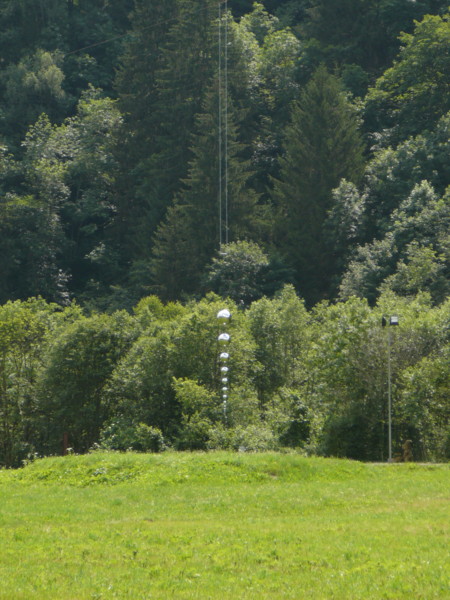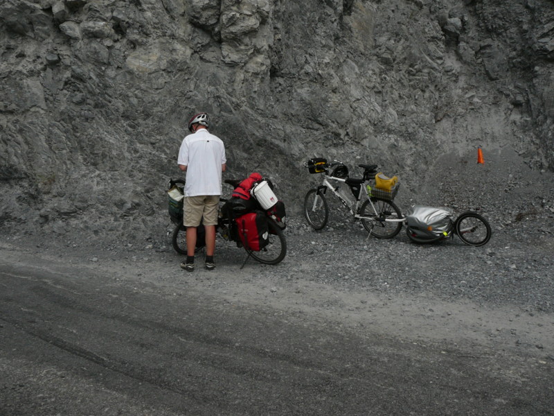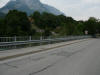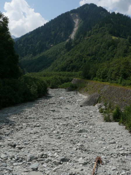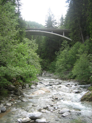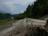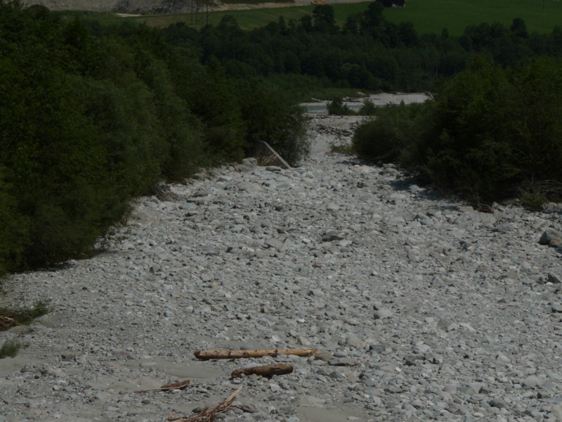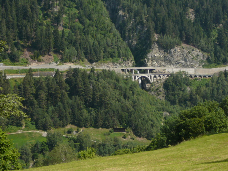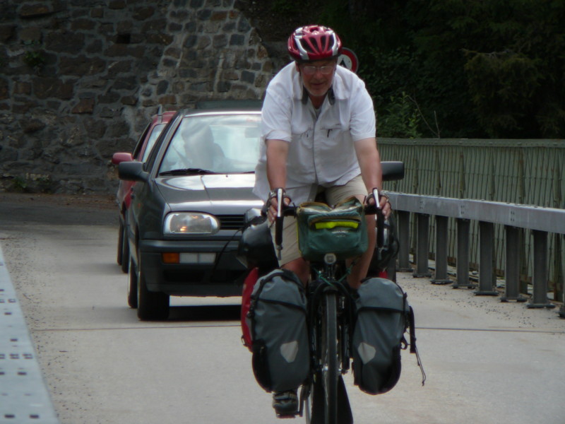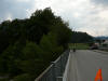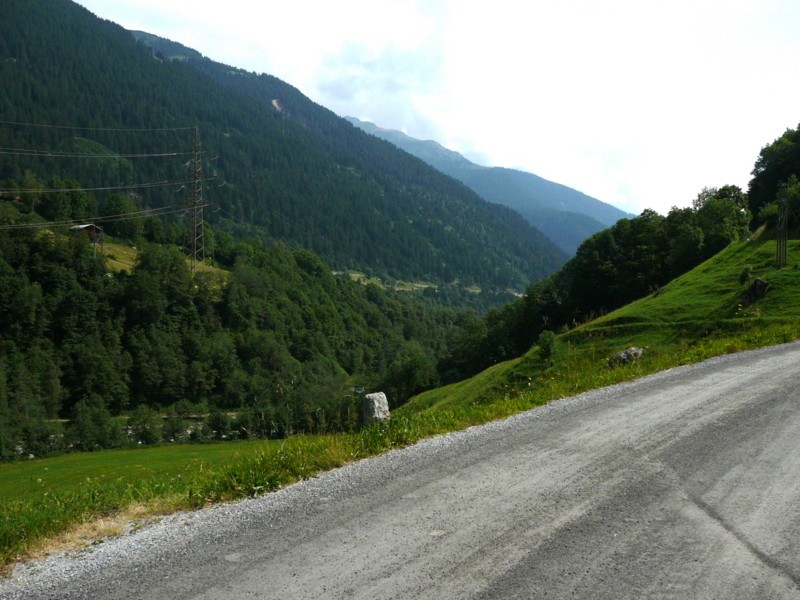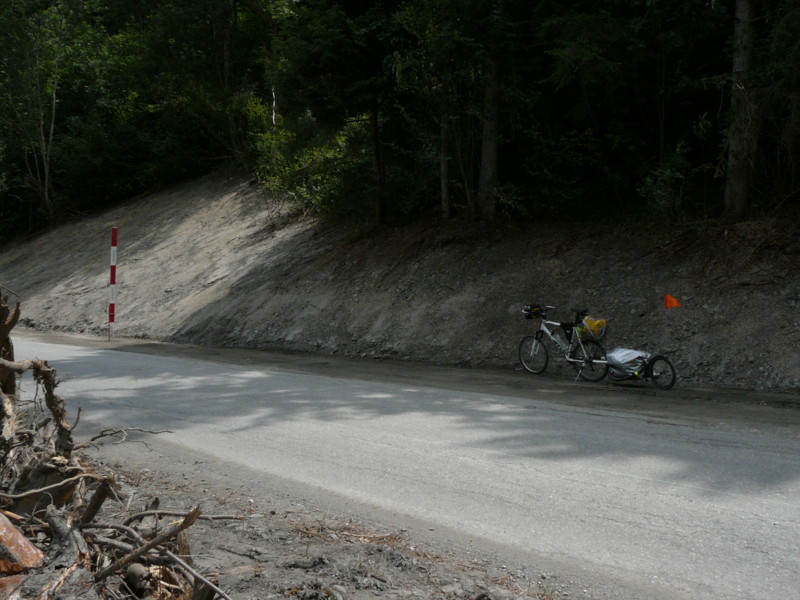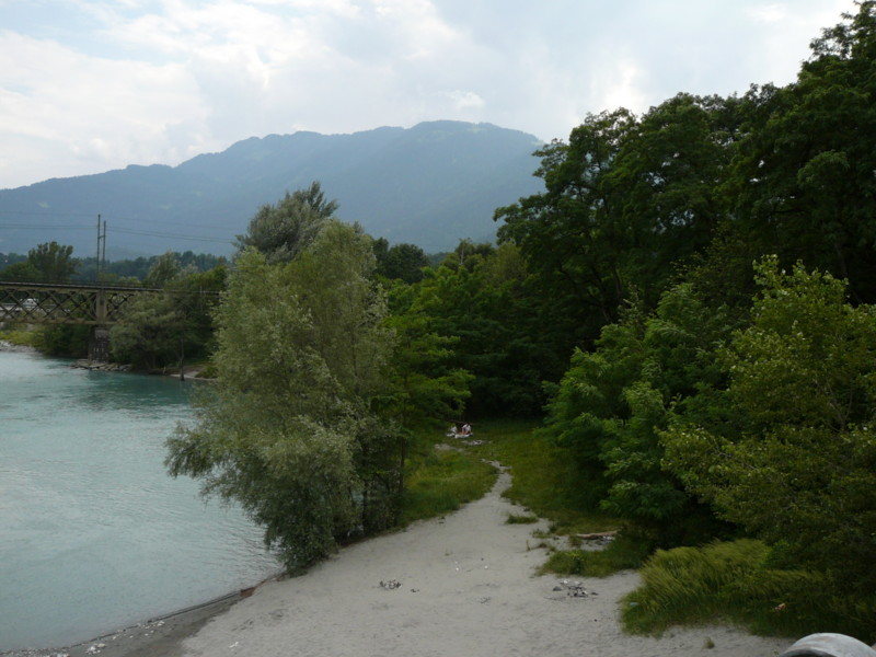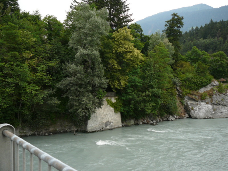 Morgens Die Fahrt ging direkt vom Campingplatz herunter über einen Moutainbike-Weg unbestestigt - nicht geeignet für Reiseräder mit Anhänger - falscher Weg!. An der Landstraße hätte man das Rheinufer wechseln müssen - linksrheinisch geht die Veloroute 2 weiter. Für uns ging es erst mal wieder auf 1100m Höhe hinauf, zwar asphaltiert, aber in einem schlechten Zustand. Wieder unbefestigt ging es am rechten Rheinufer weiter. Schöne Strecke, aber schlecht zu fahren. Es geht links und rechts auf schmalen Wegen (nur für Fußgänger und Radfahrer) zwischen Bäumen hin und her und das ständig bergab. Ich hatte keine Zeit die Landschaft zu genießen, da man ständig konzentriert sein musste, da ab und zu plötzlich Gegenverkehr auftauchte. |